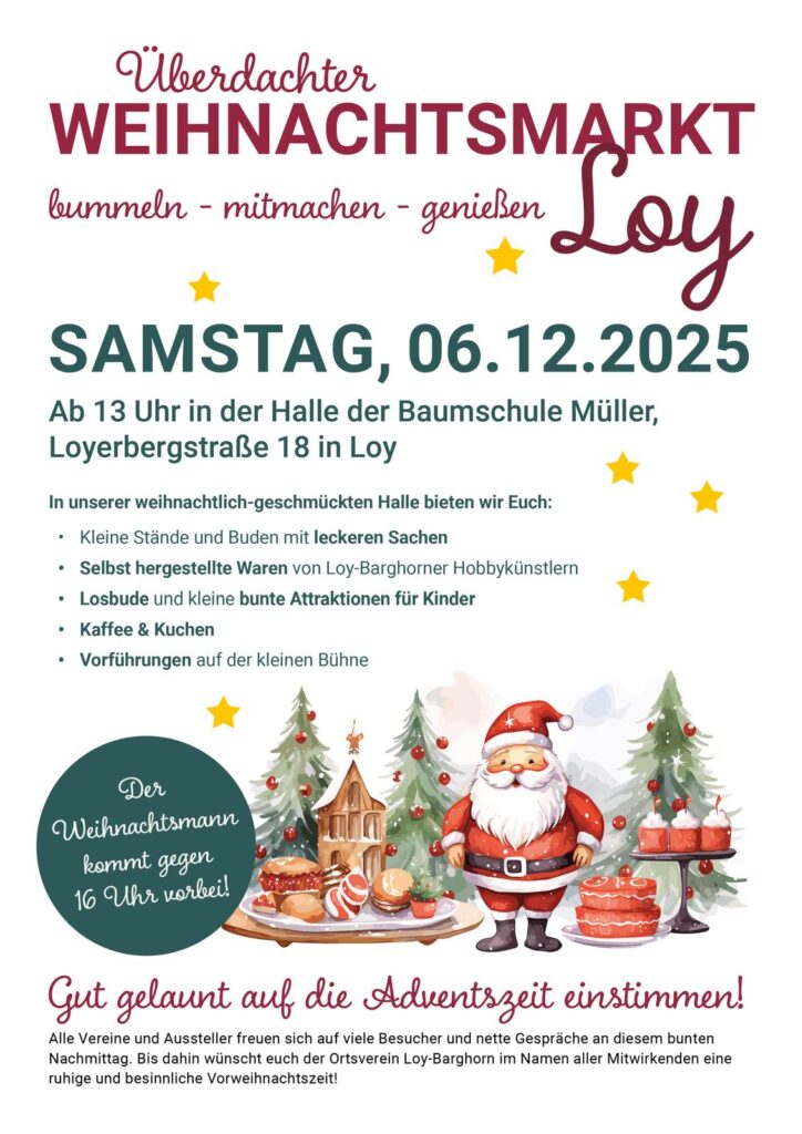 Kategorien Allgemein Beiträge aus 2025 Überdachter Weihnachtsmarkt in Loy am 6. Dezember Beitragsautor Von dkrummacker Veröffentlichungsdatum 12. November 2025 Keine Kommentare zu Überdachter Weihnachtsmarkt in Loy am 6. Dezember ← Volkstrauertag 2025 Schreibe einen Kommentar Antwort abbrechenDeine E-Mail-Adresse wird nicht veröffentlicht. Erforderliche Felder sind mit * markiertKommentar * Name * E-Mail * Website Meinen Namen, meine E-Mail-Adresse und meine Website in diesem Browser für die nächste Kommentierung speichern. You need to enable Javascript for the anti-spam check. Δ